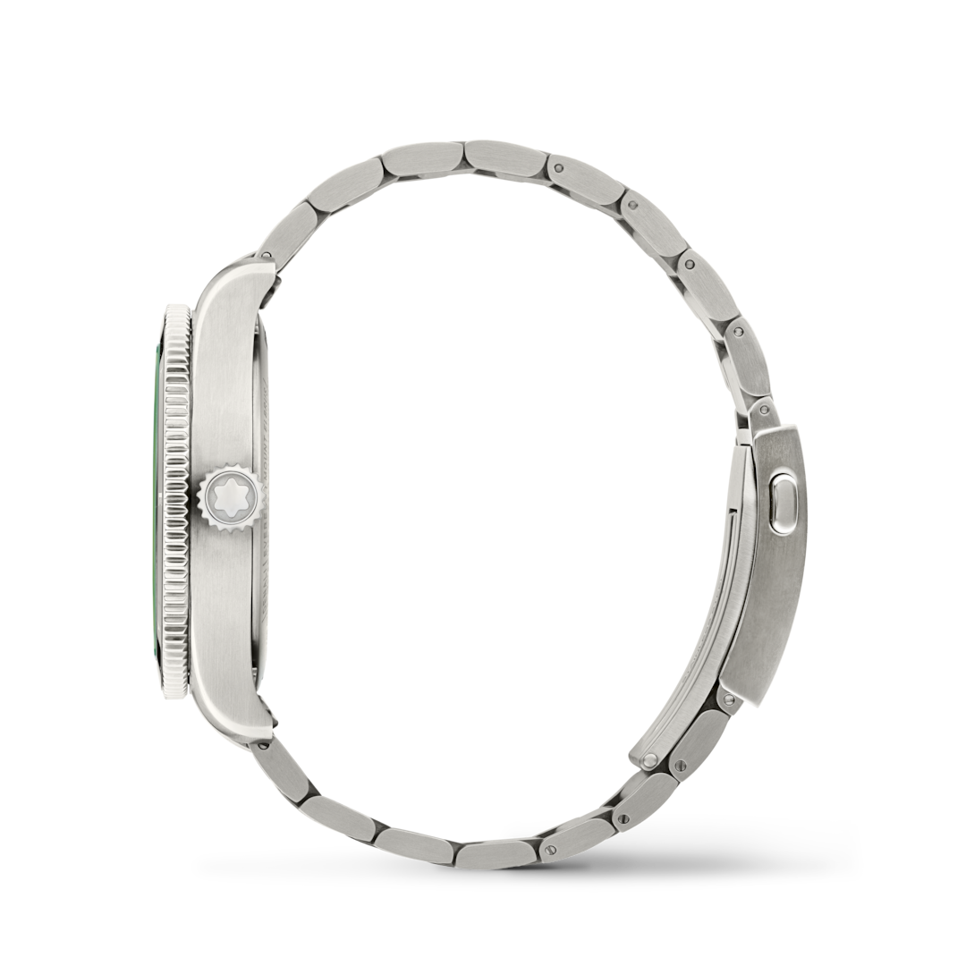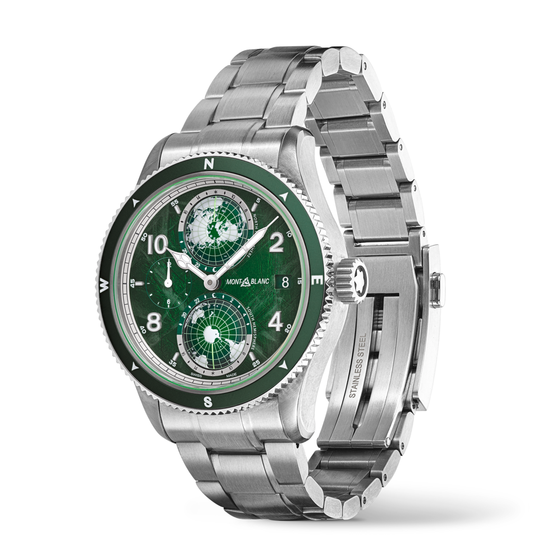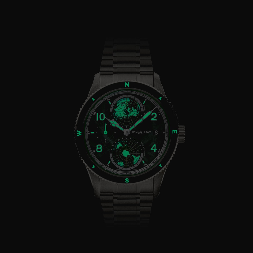 Capturant l’esprit de l’exploration en montagne, le cadran au motif glacier vert Sfumato de cette Montblanc 1858 Automatic Geosphere 0 Oxygen est inspiré de la couleur vert profond des icebergs émeraude ou « jade bergs ». Le garde-temps est logé dans un boîtier en acier inoxydable de 42 mm entièrement dépourvu d’oxygène, et doté d’une lunette crantée bidirectionnelle en aluminium anodisé vert rehaussée de points cardinaux luminescents. Animé par le calibre MB 29.25 doté de la complication heures universelles de manufacture Montblanc, ce mouvement automatique inclut des globes des hémisphères nord et sud rotatifs, une échelle 24 heures, l’indication jour/nuit, un second fuseau horaire, et une date. Une gravure laser en 3D colorée représentant le mont Blanc sur le fond de boîtier ainsi qu’un bracelet en acier inoxydable interchangeable biseauté et doté d’un système de réglage précis viennent compléter le modèle.