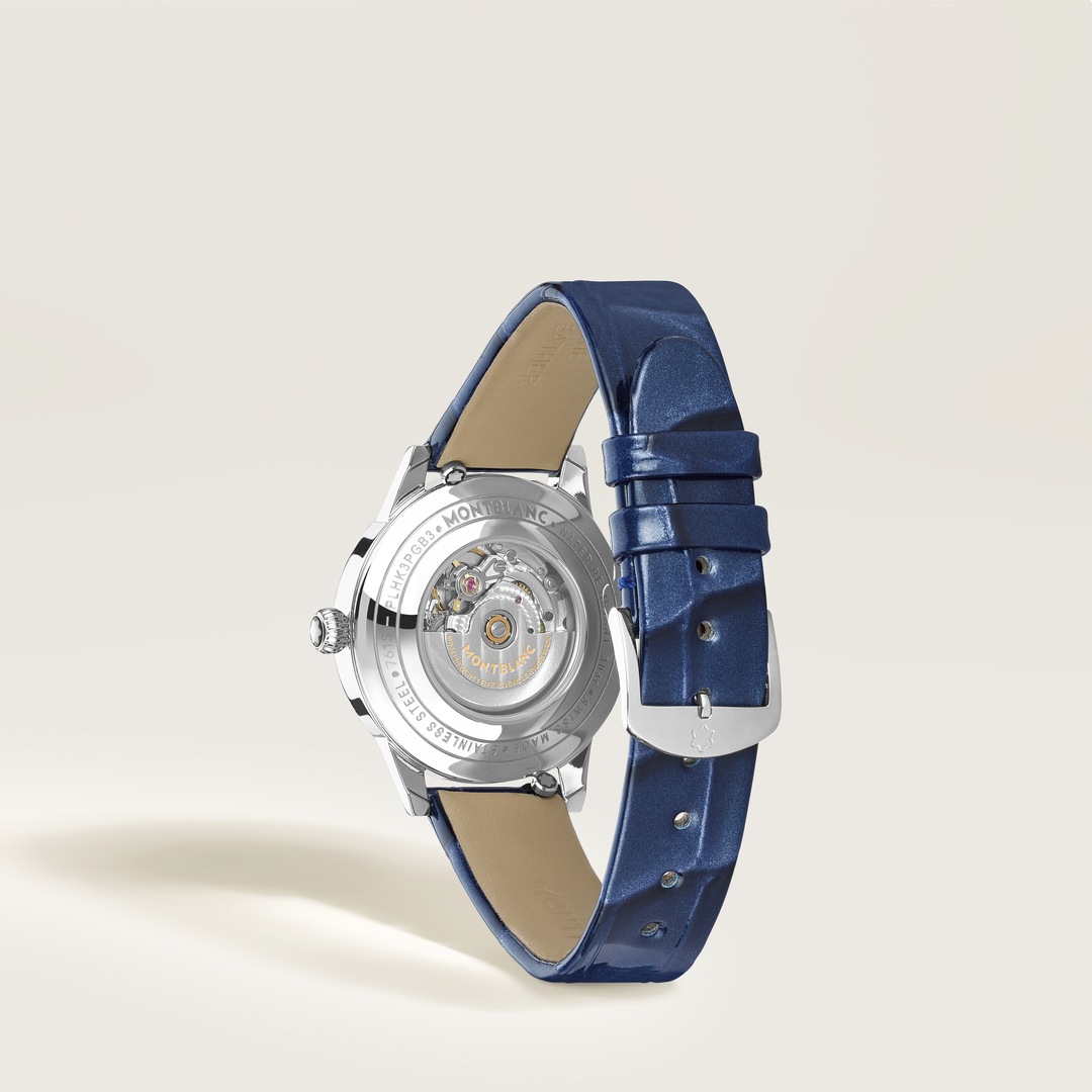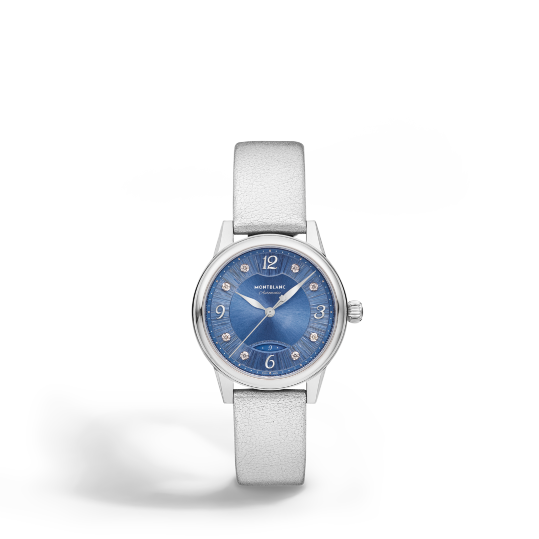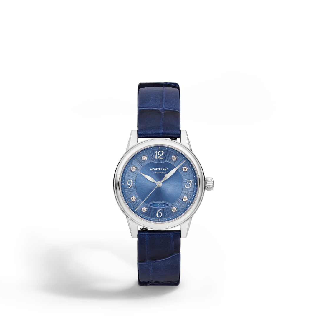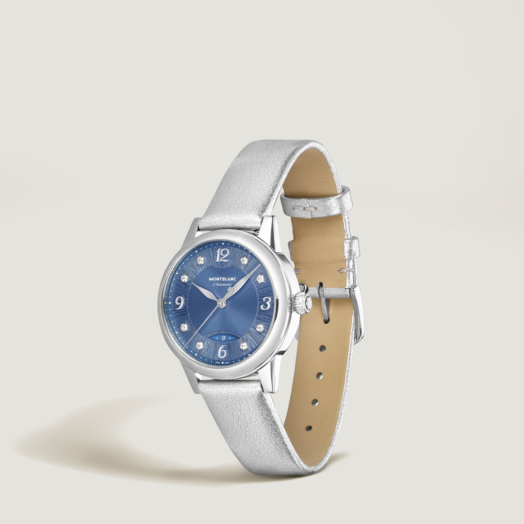 Livrant une interprétation élégante et féminine des codes de la Haute Horlogerie, la Montblanc Bohème Automatic Date, inspirée de l’univers de l’écriture, est présentée dans un boîtier de 30 mm en acier inoxydable. Elle est dotée d’un élégant cadran brossé bleu orné d’index en diamant et de chiffres arabes floraux et d’aiguilles rhodiées. Parmi les autres détails raffinés, on compte un motif filet sauté et une technique d’estampage baptisée « filé d’étoiles ». Animé par le calibre automatique MB 24.29, ce modèle indique les heures, les minutes et les secondes, ainsi que la date, affichée dans une ouverture en forme d’amande dotée de chiffres manuscrits. La police de caractères romantique a également été utilisée sur le cadran, pour la mention « Automatic ». Ce garde-temps est équipé d’un bracelet interchangeable en cuir de veau bleu à imprimé alligator, et d’un bracelet supplémentaire.