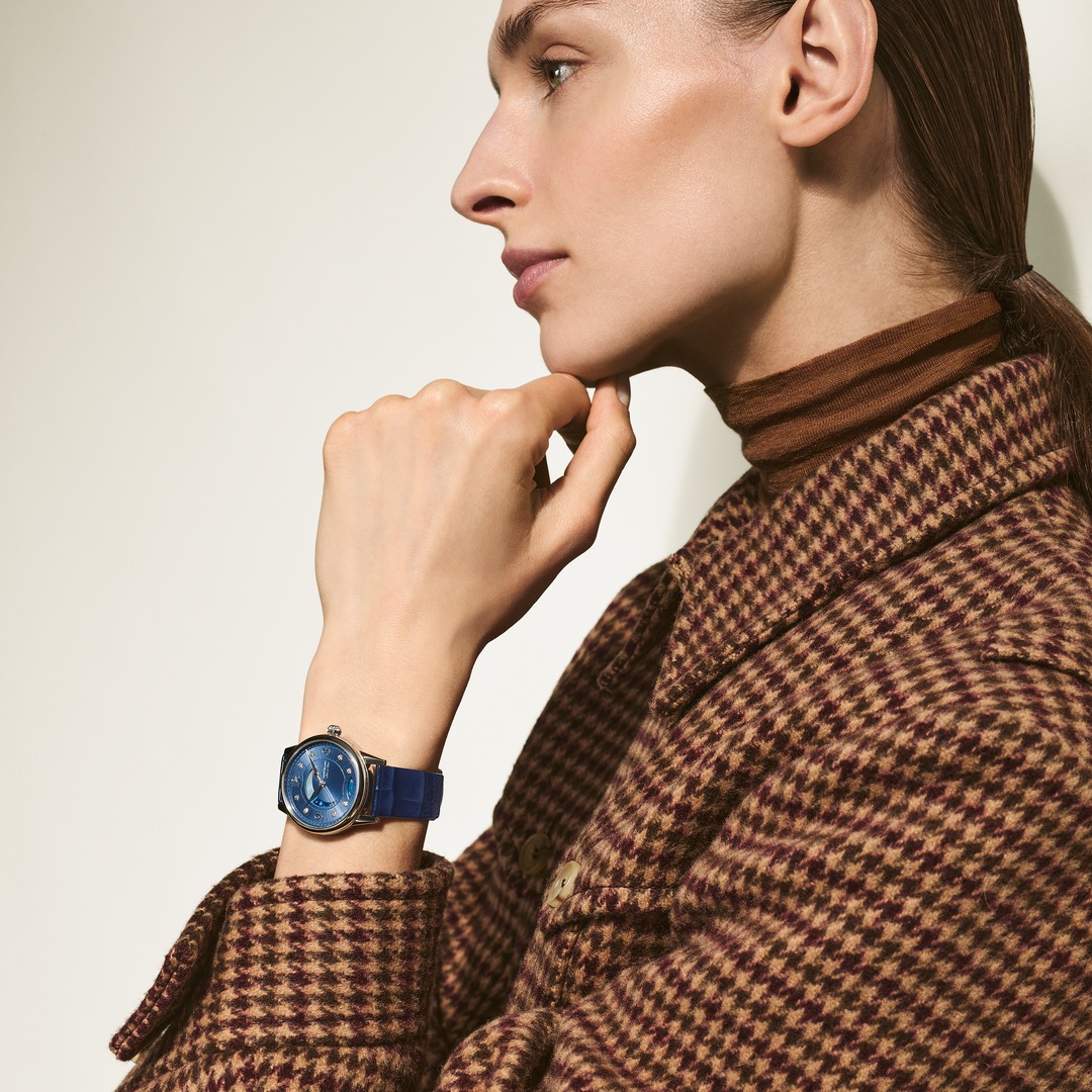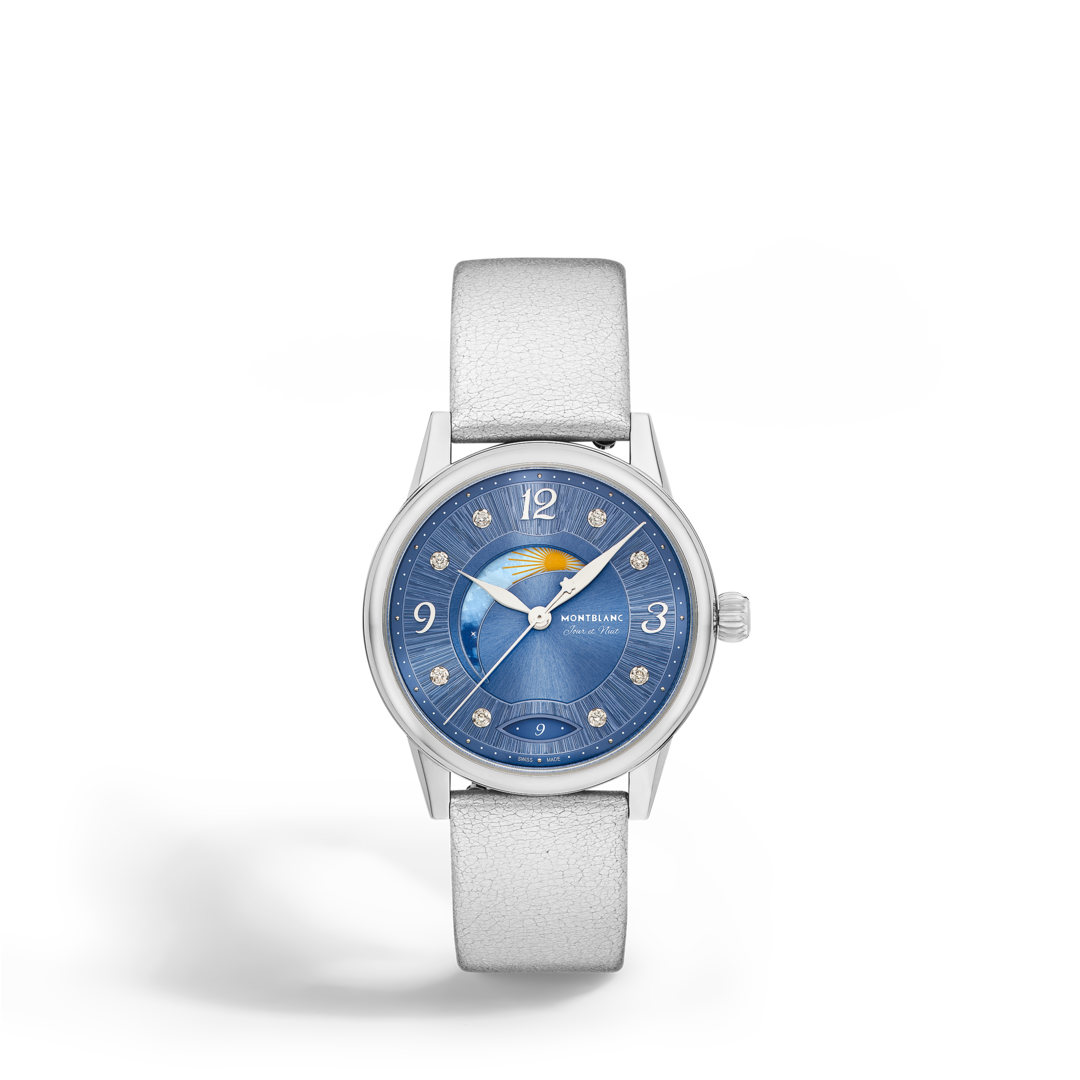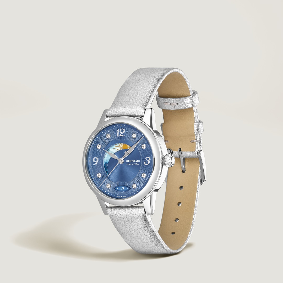 Livrant une interprétation élégante et féminine des codes de la Haute Horlogerie, la Montblanc Bohème Day & Night, inspirée de l’univers de l’écriture et de l’aquarelle, est présentée dans un boîtier de 34 mm en acier inoxydable. Elle est dotée d’un élégant cadran brossé bleu orné d’index en diamant et de chiffres arabes floraux et d’aiguilles rhodiées. Parmi les autres détails raffinés, on compte un motif filet sauté et une technique d’estampage baptisée « filé d’étoiles ». Animé par le calibre automatique MB 24.20, ce modèle indique les heures, les minutes et les secondes, ainsi que la date, affichée dans une ouverture en forme d’amande dotée de chiffres manuscrits. La police de caractères romantique a également été utilisée sur le cadran, pour la mention « Jour et Nuit ». La complication céleste jour & nuit montre le changement de couleur du ciel au cours d’une période de 24 heures et apporte une touche romantique et artistique à la montre, étant donné qu’elle est créée en aquarelle. Ce garde-temps est équipé d’un bracelet interchangeable en cuir de veau bleu à imprimé alligator, et d’un bracelet supplémentaire.