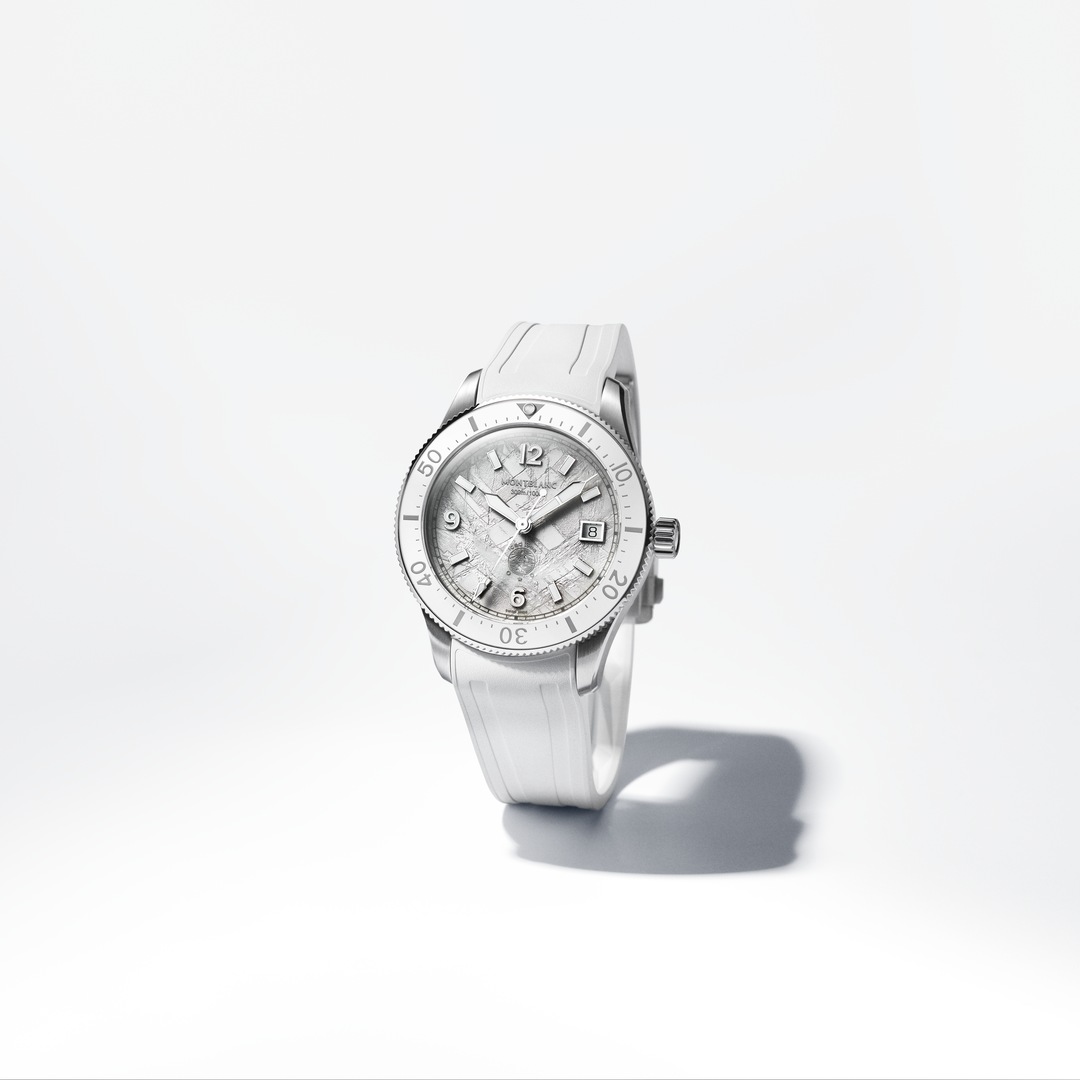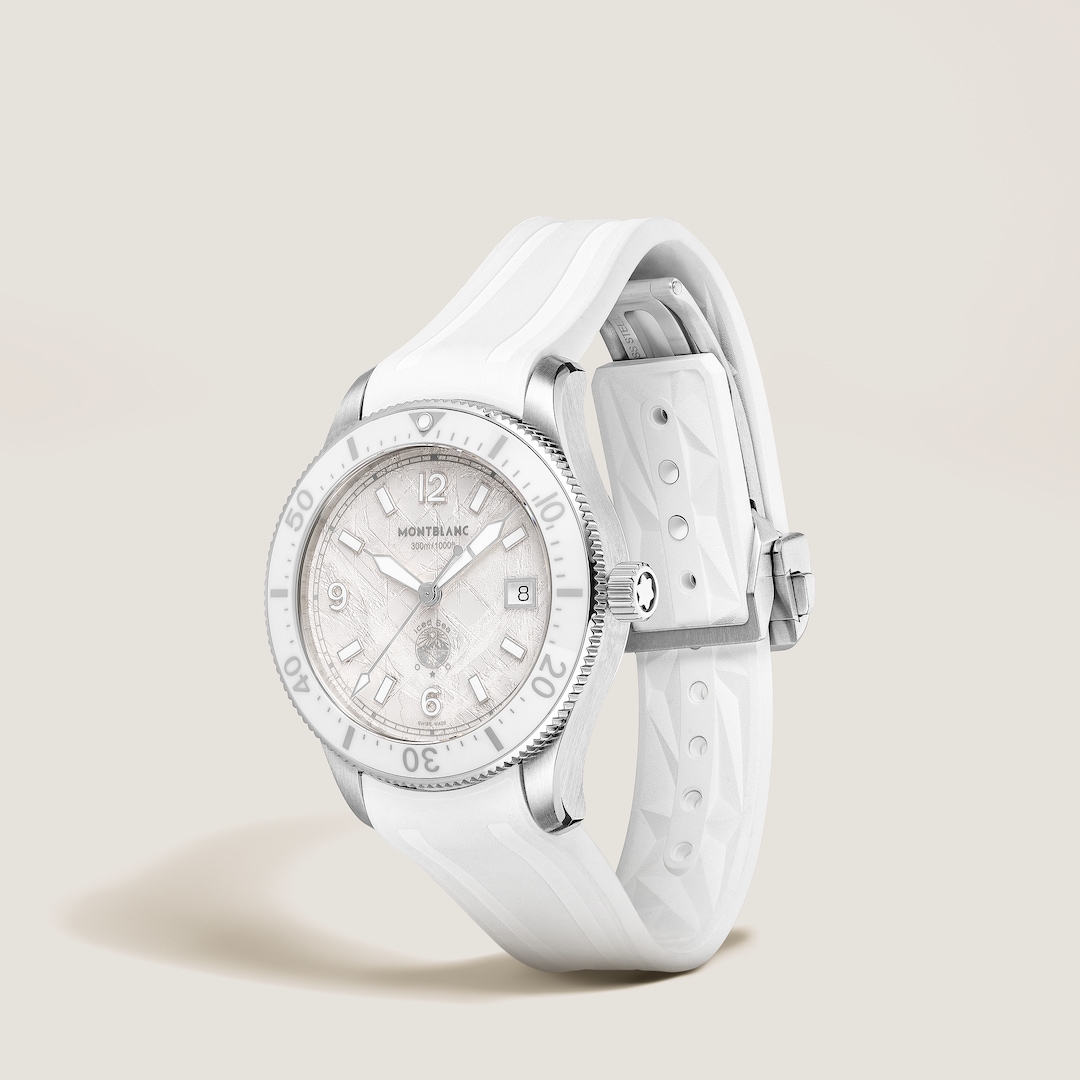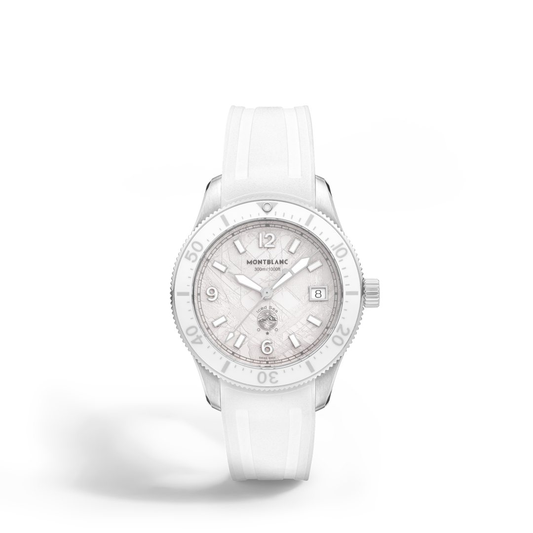 La Montblanc Iced Sea Automatic Date 0 Oxygen, avec son cadran blanc à motif glaciaire, donne l’impression de regarder dans les profondeurs d’un glacier. Inspirée de la Mer de Glace, cette texture glaciale a été réalisée à l’aide d’une technique ancestrale presque oubliée appelée gratté-boisé. La montre est logée dans un boîtier de 38 mm en acier inoxydable totalement dépourvu d’oxygène et s’accompagne d’une lunette tournante unidirectionnelle avec insert en céramique blanche, d’une gravure en 3D sur le fond du boîtier et d’un bracelet interchangeable en caoutchouc blanc avec système d’ajustement fin. Cette montre est conforme à la norme ISO 6425 pour la plongée sous-marine, et se caractérise par une étanchéité à 300 m.