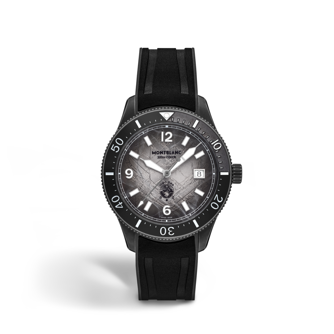 La Montblanc Iced Sea Automatic Date 0 Oxygen, avec son cadran gris sfumato à motif glaciaire, donne l’impression de regarder dans les profondeurs d’un glacier. Inspirée de la Mer de Glace, cette texture glaciale a été réalisée à l’aide d’une technique ancestrale presque oubliée appelée gratté-boisé. La montre est logée dans un boîtier de 41 mm en acier vieilli totalement dépourvu d’oxygène et s’accompagne d’une lunette tournante unidirectionnelle avec insert en céramique noire abaissée au laser de 0 à 15 minutes, d’une gravure en 3D sur le fond du boîtier et d’un bracelet interchangeable en caoutchouc noir avec système d’ajustement fin. Cette montre est conforme à la norme ISO 6425 pour la plongée sous-marine, et se caractérise par une étanchéité à 300 m.
