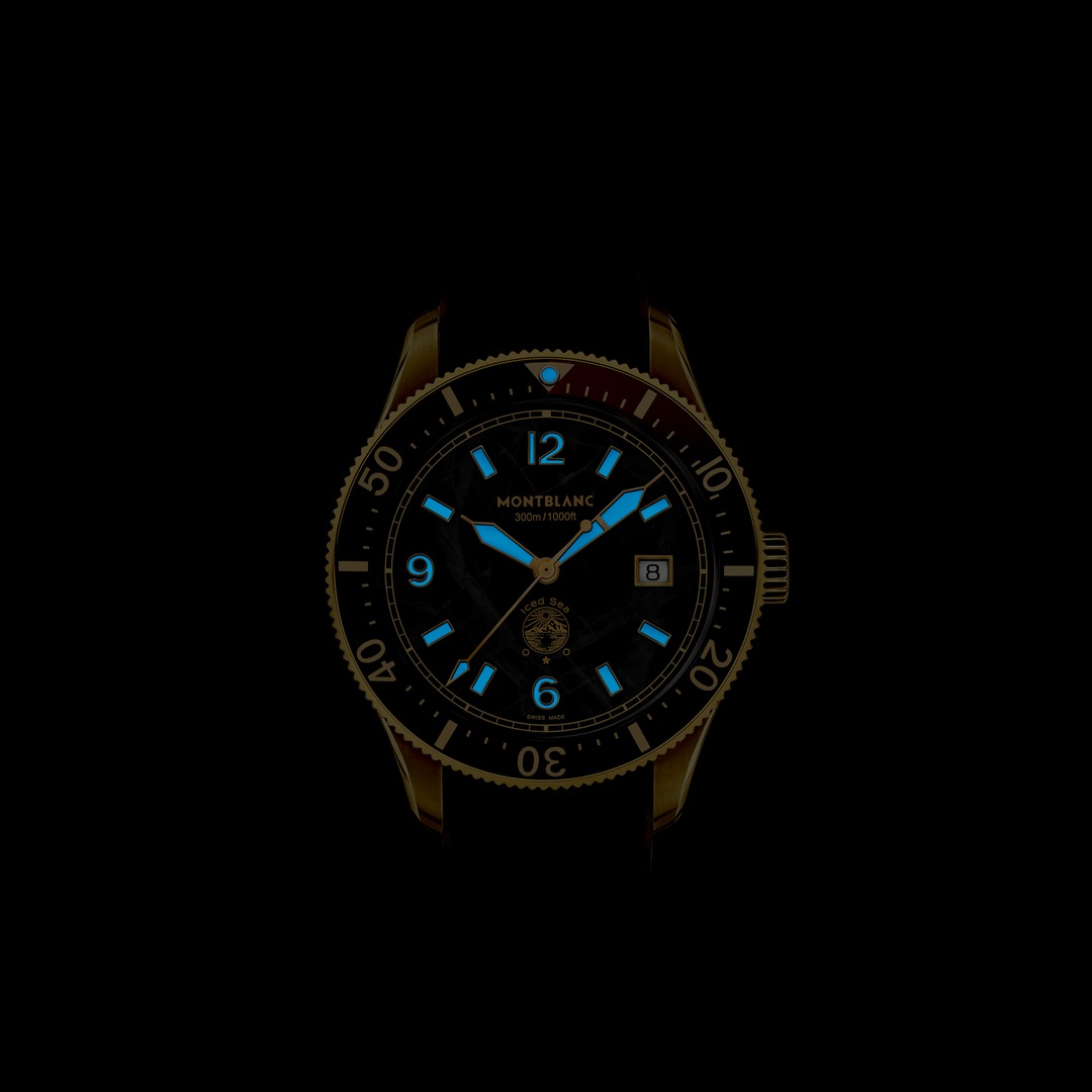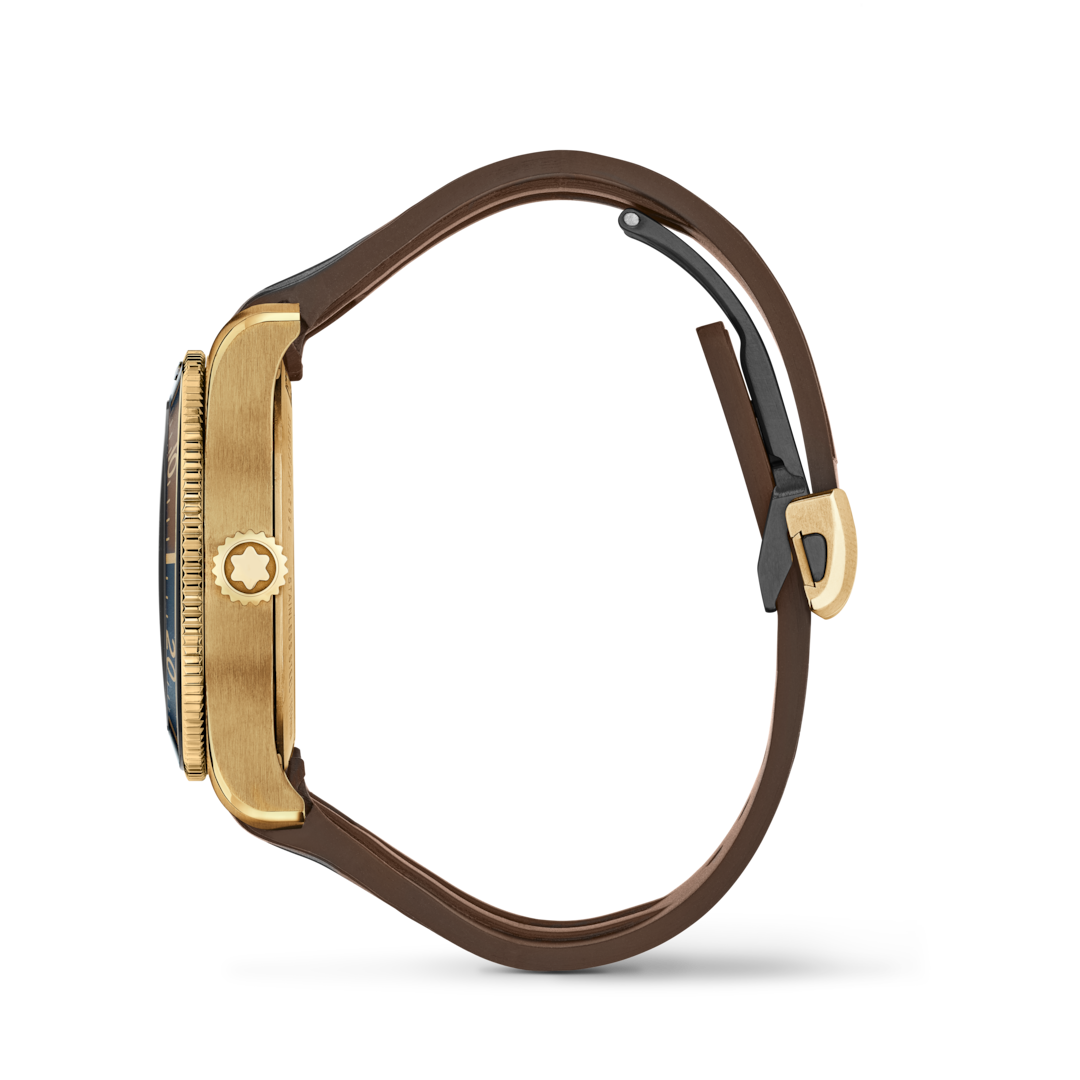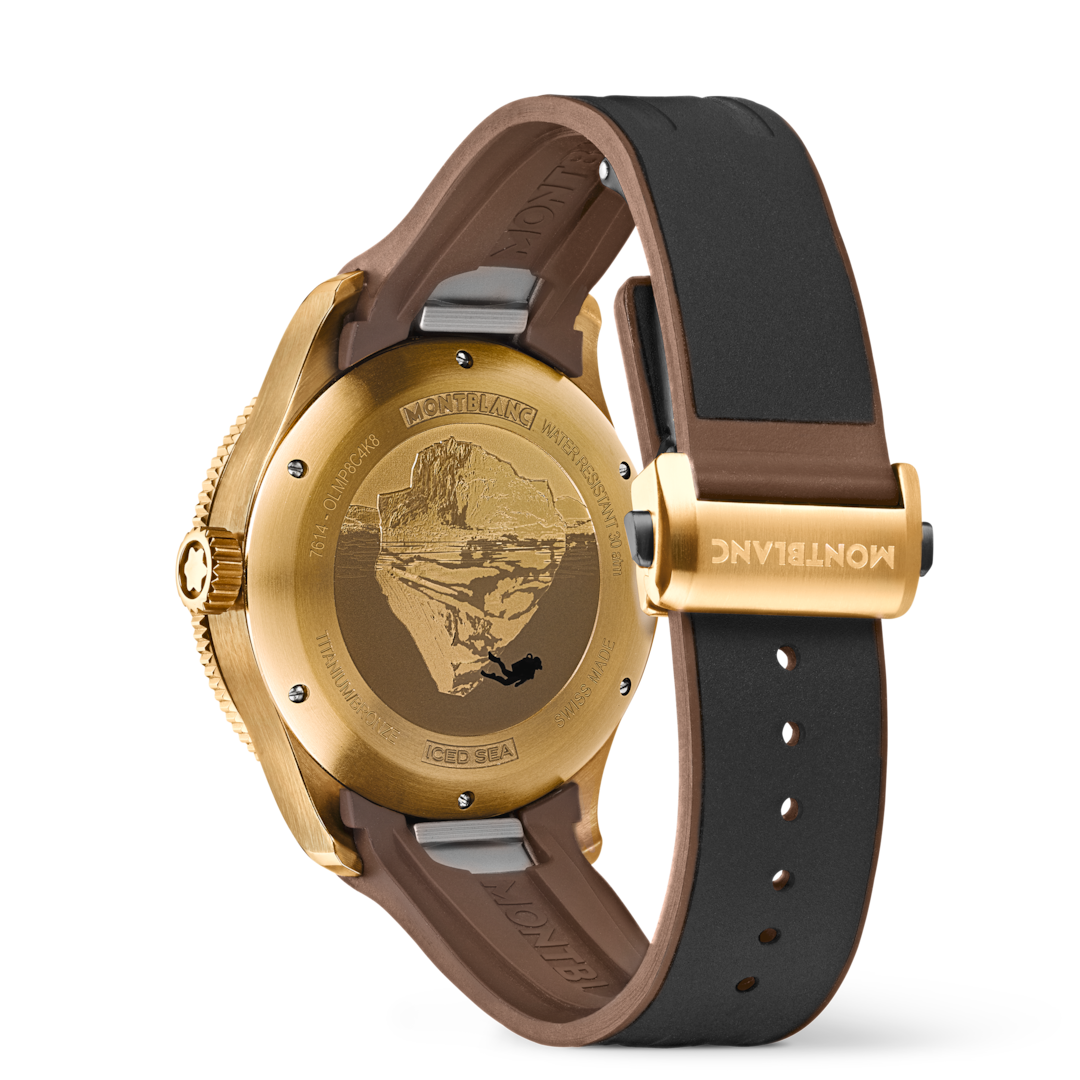 Capturant la couleur du soleil couchant sur le glacier, cette Montblanc Iced Sea Automatic Date allie un cadran à motif glacier noir et un boîtier bronze chaud. Le motif glacier de ce cadran est inspiré de la Mer de Glace, principal glacier du massif du Mont-Blanc. Sa texture est le résultat d’une technique ancestrale presque oubliée appelée gratté-boisé. Cette édition en bronze est caractérisée par une lunette unidirectionnelle bicolore en aluminium anodisé, une gravure en 3D sur le fond de boîtier en titane recouvert de bronze et un bracelet en caoutchouc noir interchangeable rehaussé d’un contour marron et doté d’un système de réglage précis. Elle est étanche jusqu’à 300 mètres.