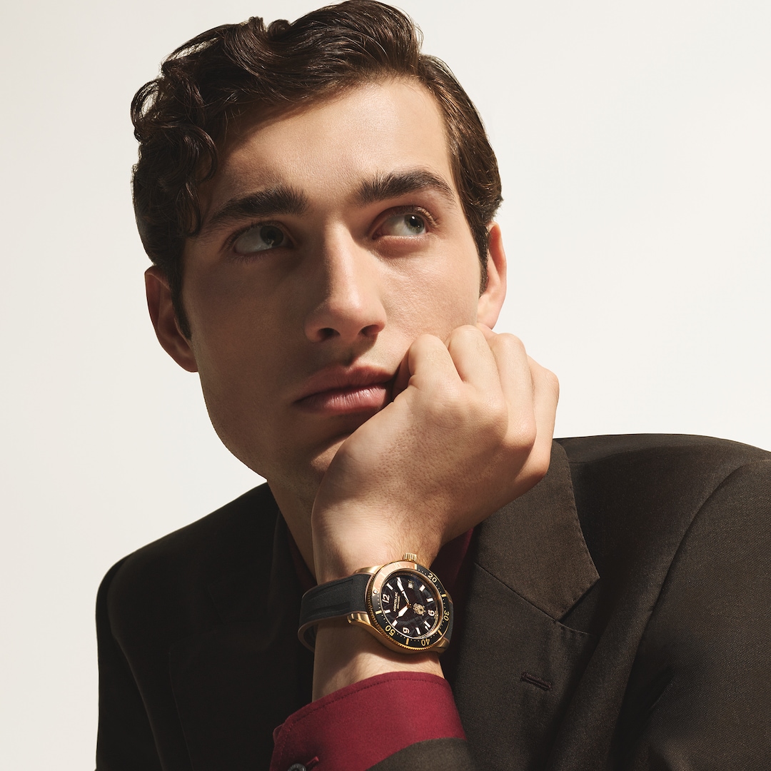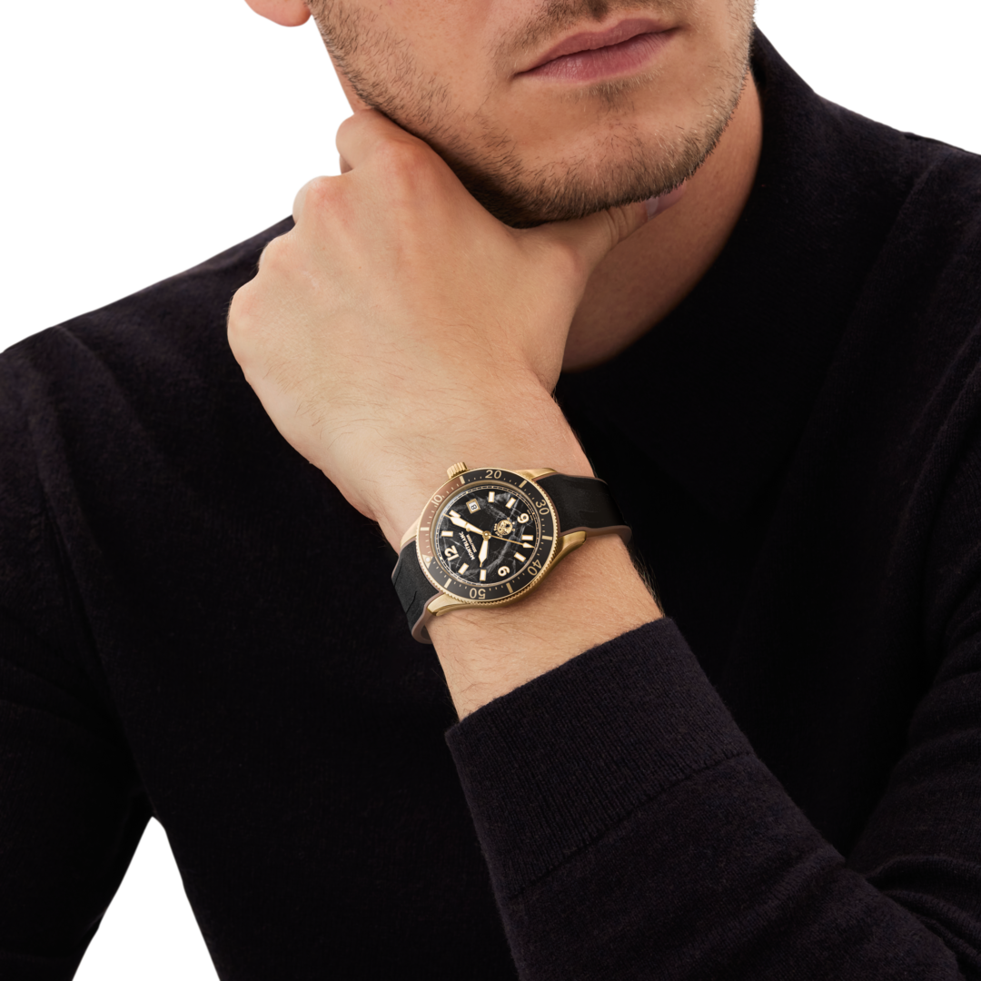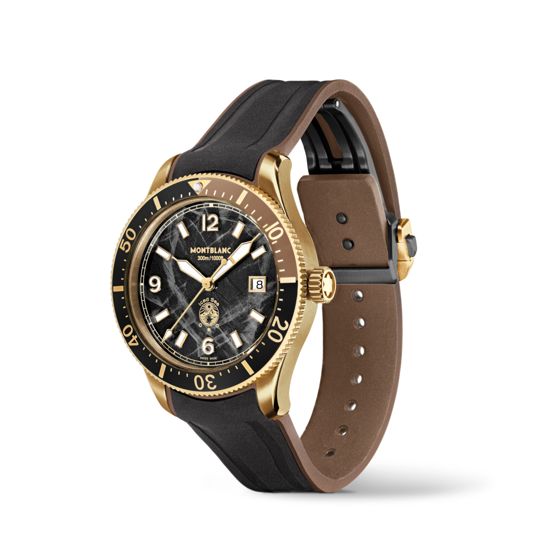 Capturant la couleur du soleil couchant sur le glacier, cette Montblanc Iced Sea Automatic Date allie un cadran à motif glacier noir et un boîtier bronze chaud. Le motif glacier de ce cadran est inspiré de la Mer de Glace, principal glacier du massif du Mont-Blanc. Sa texture est le résultat d’une technique ancestrale presque oubliée appelée gratté-boisé. Cette édition en bronze est caractérisée par une lunette unidirectionnelle bicolore en aluminium anodisé, une gravure en 3D sur le fond de boîtier en titane recouvert de bronze et un bracelet en caoutchouc noir interchangeable rehaussé d’un contour marron et doté d’un système de réglage précis. Elle est étanche jusqu’à 300 mètres.