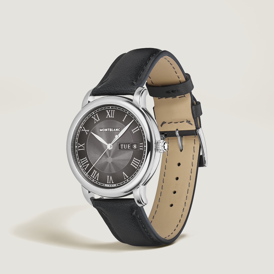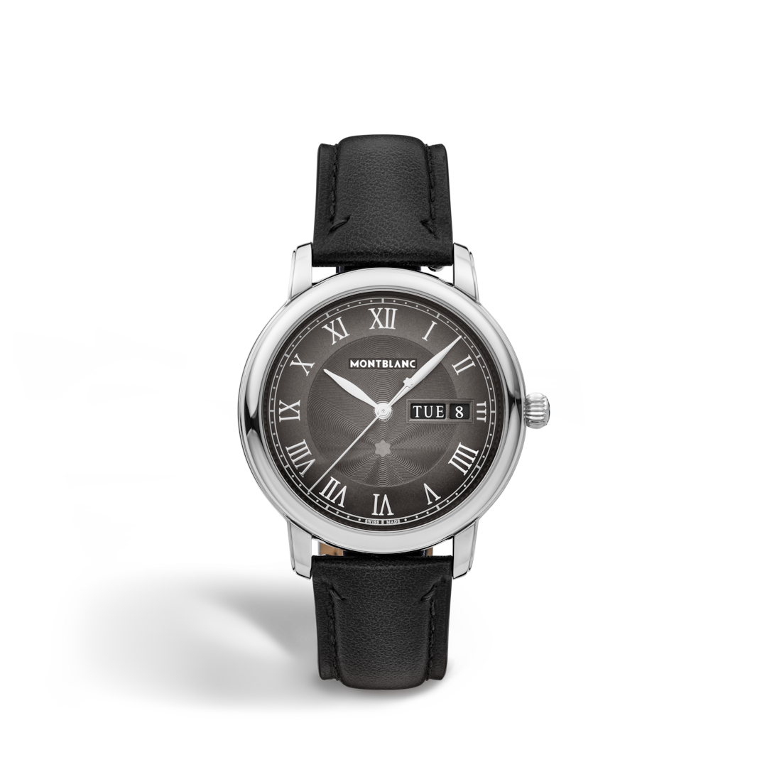 La Montblanc Star Legacy Automatic Day & Date porte les codes de design les plus raffinés de la Maison à un nouveau niveau d’élégance. La montre présente un cadran anthracite Sfumato orné d’un motif en forme d’étoile guilloché, un filet sauté, des chiffres romains rhodiés, des aiguilles en forme de feuille et indique les heures, les minutes, les secondes, le jour en français ou anglais au choix et la date avec élégance. Ce modèle est doté d’un mouvement automatique MB 24.28 et est logé dans un boîtier en acier inoxydable de 39 mm de forme galet, avec un fond de boîtier ajouré offrant une vue sur la masse oscillante ornée de l’emblème Montblanc. Avec le bracelet interchangeable en cuir de veau anthracite, conçu spécialement par Marco Tomasetta, directeur artistique de Montblanc, s’est inspiré des plumes d’instrument d’écriture de la Maison pour sa forme pointue, rehaussé d’un effet Sfumato vertical.