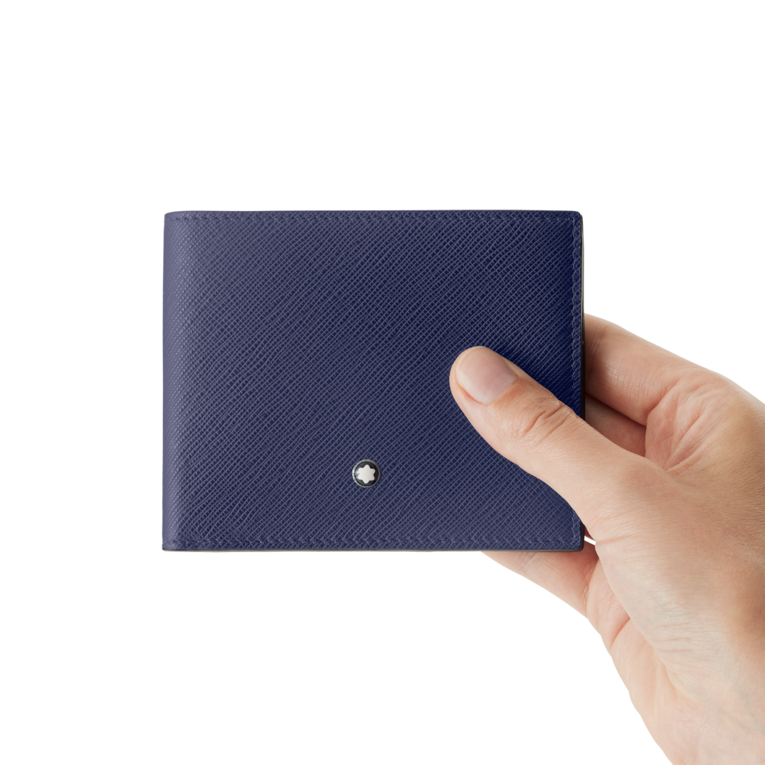 Un indispensable qui se glisse facilement dans la plupart des poches. Confectionné en cuir imprimé Saffiano couleur ink blue, le portefeuille est muni de fentes pouvant contenir jusqu’à six cartes de crédit. Il comporte deux emplacements pour les billets de banque et deux poches supplémentaires pour conserver de petits objets.