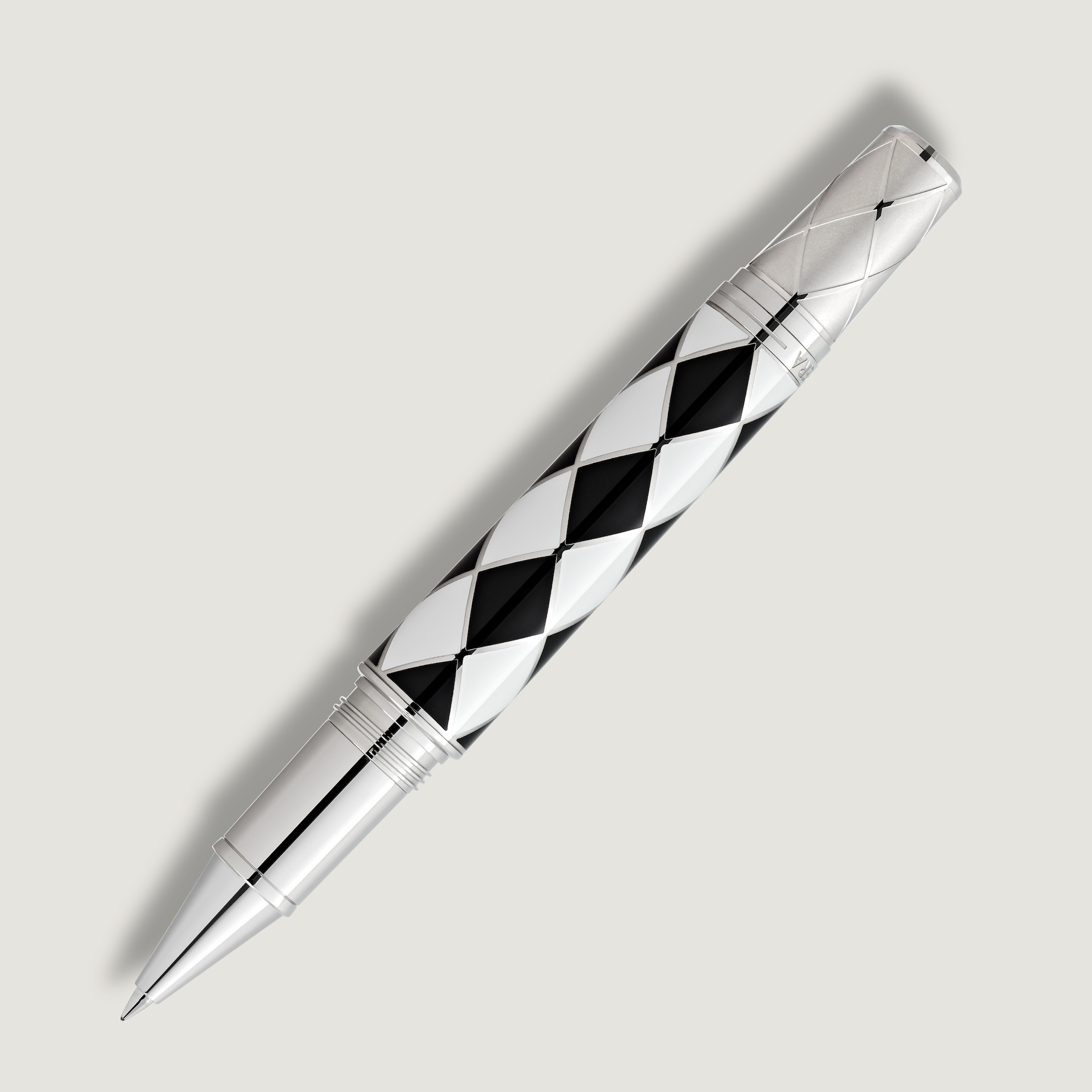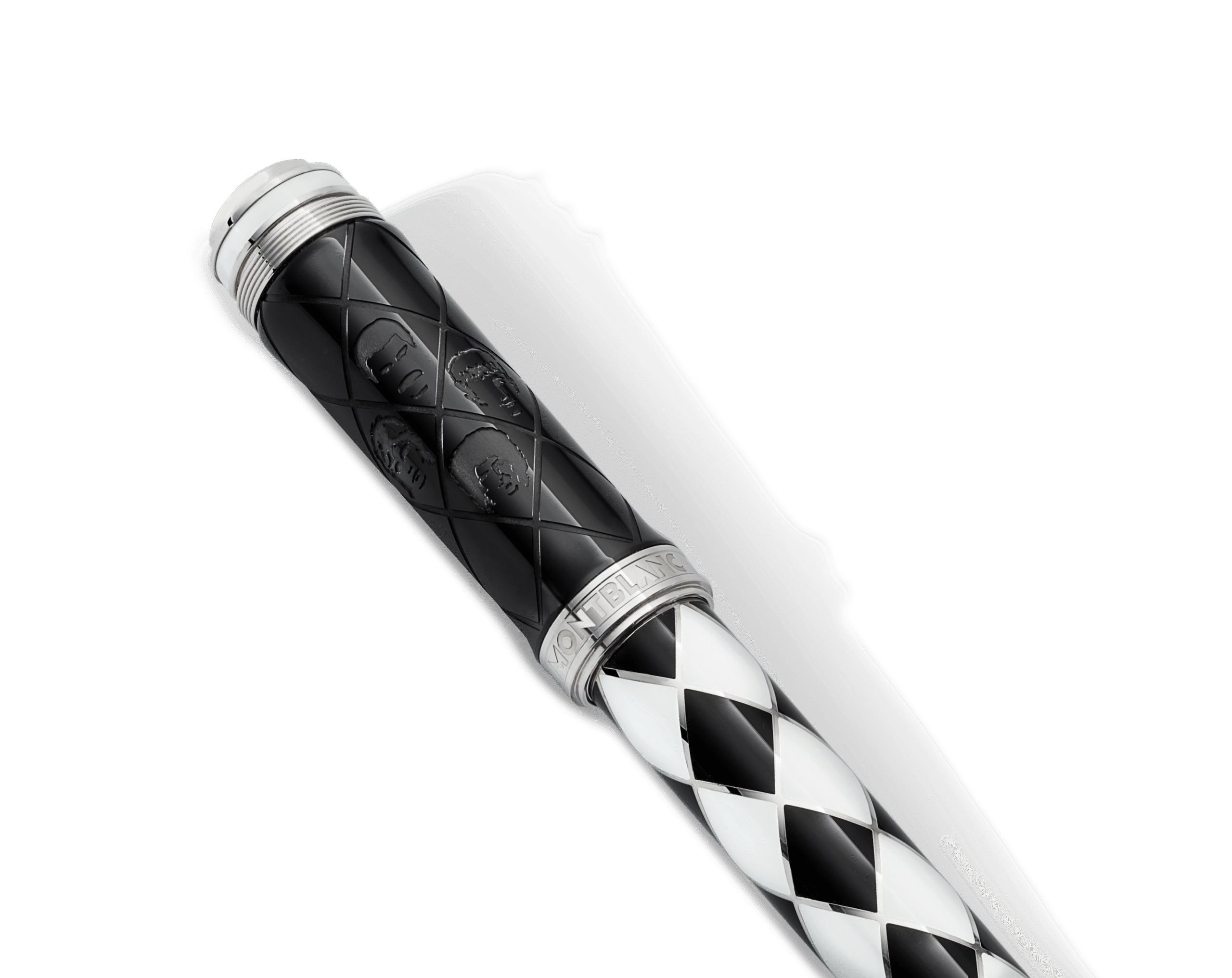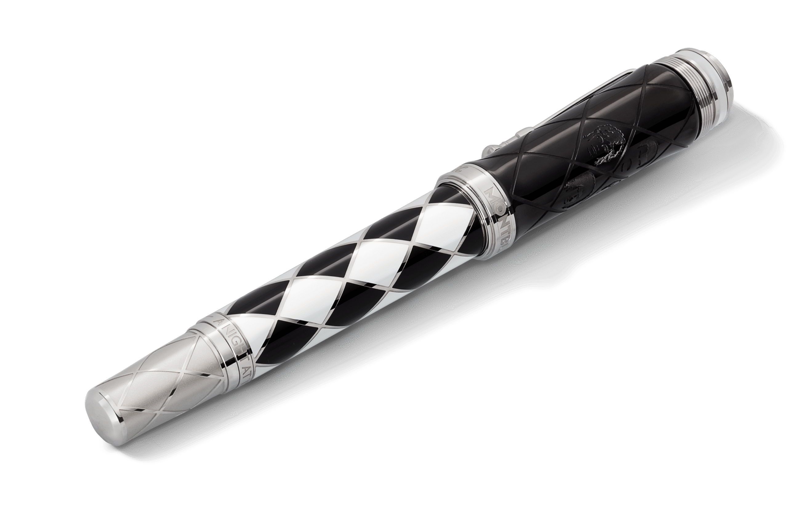 L’album A Night at the Opera, et en particulier son morceau phare Bohemian Rhapsody, illustre le rêve de Freddie Mercury de créer un album aux proportions épiques. L’arrangement extravagant de six minutes du single combine des ballades au piano, de l’opéra et du rock, entrecoupés de couches successives de voix lyriques et de références excentriques à des personnages tels que Galilée ou Scaramouche, une figure de la Commedia dell’Arte. Freddie Mercury lui-même, connu pour ses costumes de scène flamboyants, se glissait souvent dans la peau d’un autre personnage de la Commedia dell’Arte, Arlequin. Son célèbre justaucorps moulant à motifs losanges noirs et blancs soulignait son personnage scénique non conventionnel et a inspiré le design rhombique du corps. Cette édition rend également hommage à Brian May et à son incroyable jeu de guitare, qui a joué un rôle si important dans le son de l’album, en donnant au cône platiné son aspect distinctif. Celui-ci rappelle les boutons de réglage du volume et de la tonalité de la célèbre guitare électrique de Brian May. Le nom de l’album est gravé sur l’anneau du cône : A Night at the Opera. L’année de sa sortie, 1975, a inspiré la décision de limiter l’édition à 1975 stylos plume et 1975 rollerballs.