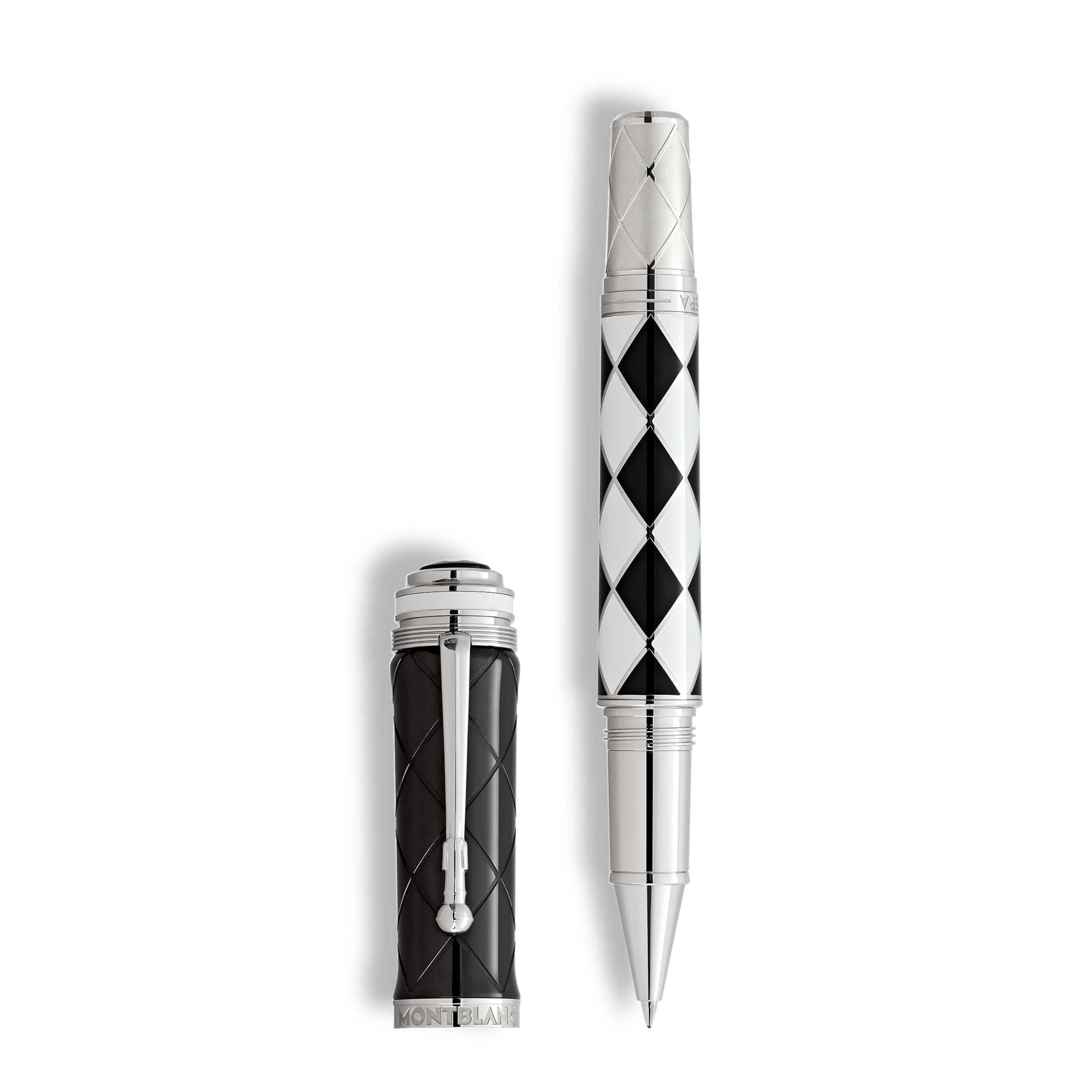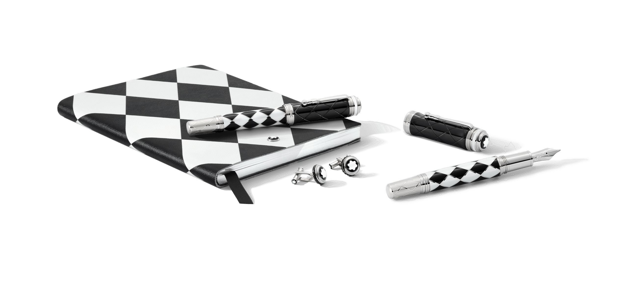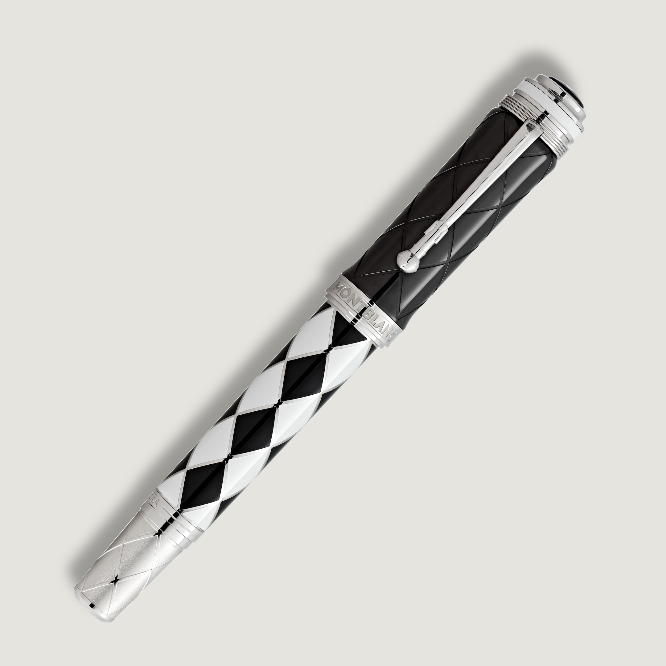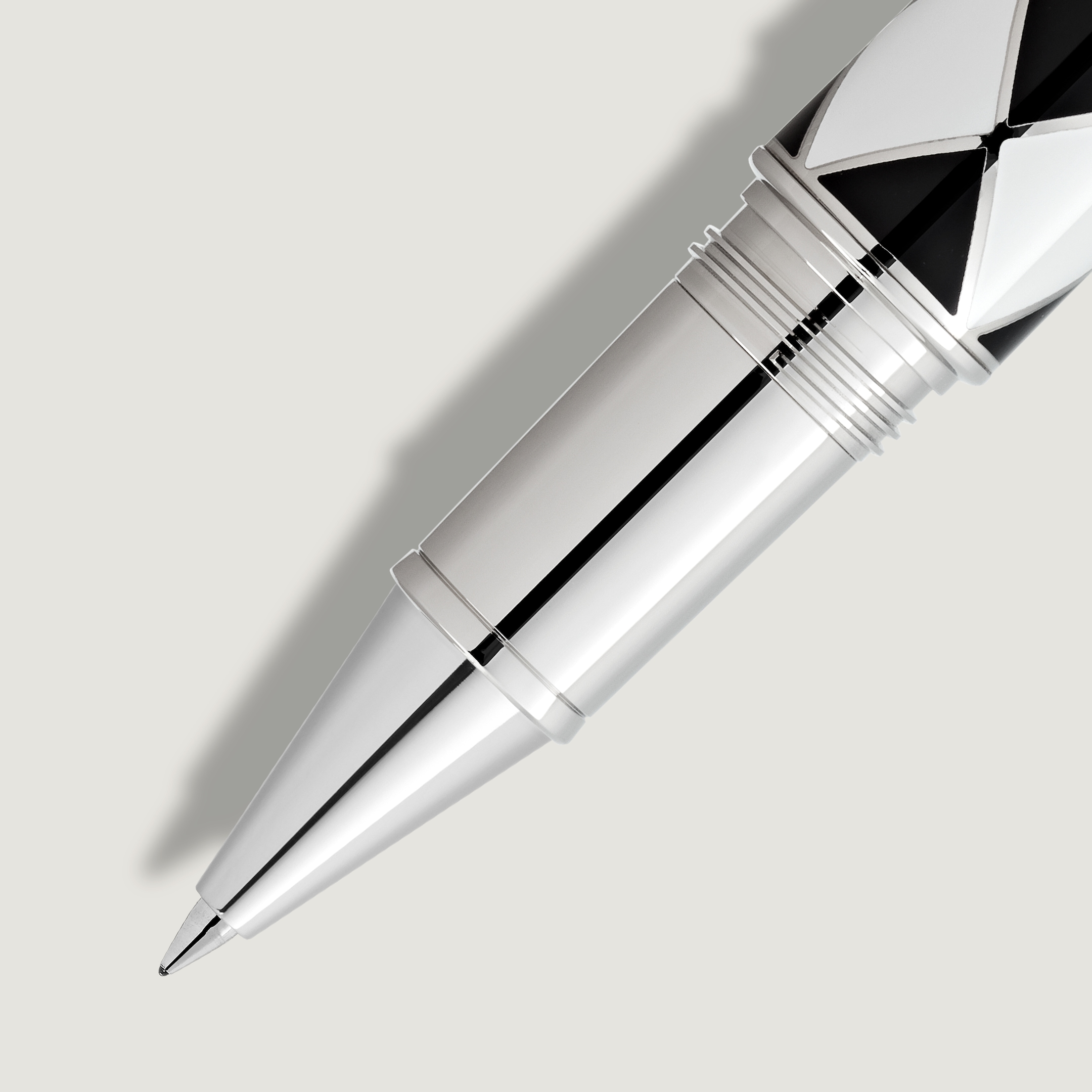 L’album A Night at the Opera, et en particulier son morceau phare Bohemian Rhapsody, illustre le rêve de Freddie Mercury de créer un album aux proportions épiques. L’arrangement extravagant de six minutes du single combine des ballades au piano, de l’opéra et du rock, entrecoupés de couches successives de voix lyriques et de références excentriques à des personnages tels que Galilée ou Scaramouche, une figure de la Commedia dell’Arte. Freddie Mercury lui-même, connu pour ses costumes de scène flamboyants, se glissait souvent dans la peau d’un autre personnage de la Commedia dell’Arte, Arlequin. Son célèbre justaucorps moulant à motifs losanges noirs et blancs soulignait son personnage scénique non conventionnel et a inspiré le design rhombique du corps. Cette édition rend également hommage à Brian May et à son incroyable jeu de guitare, qui a joué un rôle si important dans le son de l’album, en donnant au cône platiné son aspect distinctif. Celui-ci rappelle les boutons de réglage du volume et de la tonalité de la célèbre guitare électrique de Brian May. Le nom de l’album est gravé sur l’anneau du cône : A Night at the Opera. L’année de sa sortie, 1975, a inspiré la décision de limiter l’édition à 1975 stylos plume et 1975 rollerballs.