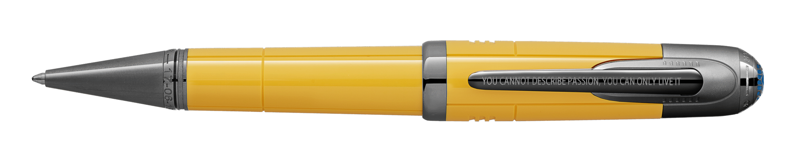 Inspirée à la fois des armoiries de Modène, la ville natale d’Enzo Ferrari, et de la couleur emblématique du logo de la Scuderia, cette édition rend hommage à la deuxième âme de Ferrari, la couleur jaune. Les dates de naissance d’Enzo Ferrari et de sa première course victorieuse sont gravées sur le cône, tandis que sa signature et le nom de l’atelier de son père, « Officina Meccanica Alfredo Ferrari », en référence au lieu de naissance d’Enzo Ferrari, sont gravés sur le sommet du capuchon. Il est couronné par l’emblème Montblanc en résine bleue précieuse, un hommage supplémentaire aux armoiries de Modène, et entouré de ferronnerie complexe évoquant une grille de voiture vintage.