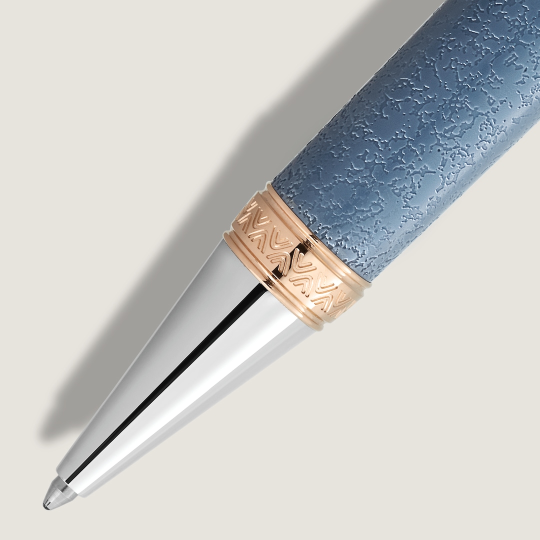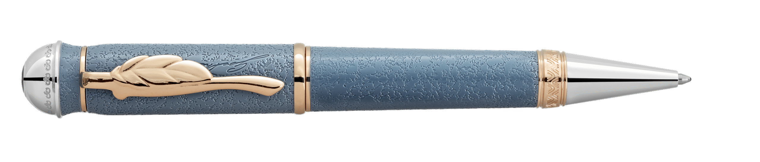 Un charmant motif ressemblant à un collier de feuilles de trèfle est gravé sur le dessus du capuchon. Ce détail provient d’une lettre écrite par Goethe à sa bien-aimée Charlotte Buff, qui a servi de modèle au personnage de Lotte dans Les Souffrances du jeune Werther. Œuvre remarquable du mouvement Sturm und Drang, le roman épistolaire du jeune Goethe a été salué comme un coup de génie et, surtout, comme un chef-d’œuvre de la littérature mondiale. Dans une lettre du 26 janvier 1827, Goethe a interprété le terme « littérature mondiale » d’une manière beaucoup plus littérale qu’aujourd’hui, signifiant un processus mondial de communication littéraire et de stimulation artistique mutuelle. De la même manière qu’il a incorporé des éléments de la poésie persane dans son cycle du Diwan occidental-oriental, cette littérature devrait aspirer à être l’expression de l’universalité, transcendant toutes les barrières linguistiques, ethniques et temporelles. Symbole de ce concept de dialogue littéraire global, incarné par le terme de « littérature mondiale » de Goethe, le capuchon prend la forme d’un globe, couronné par l’emblème de Montblanc.