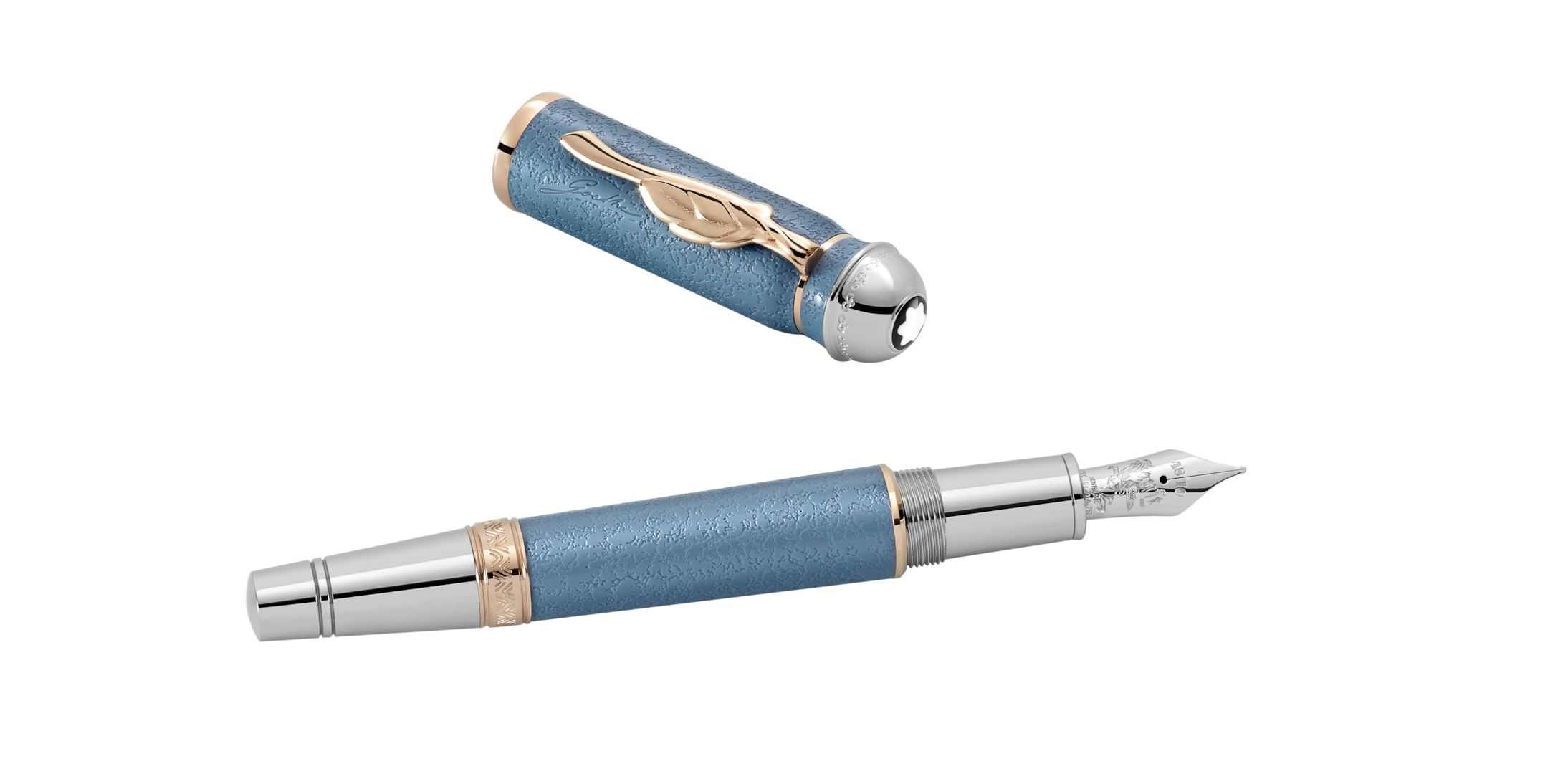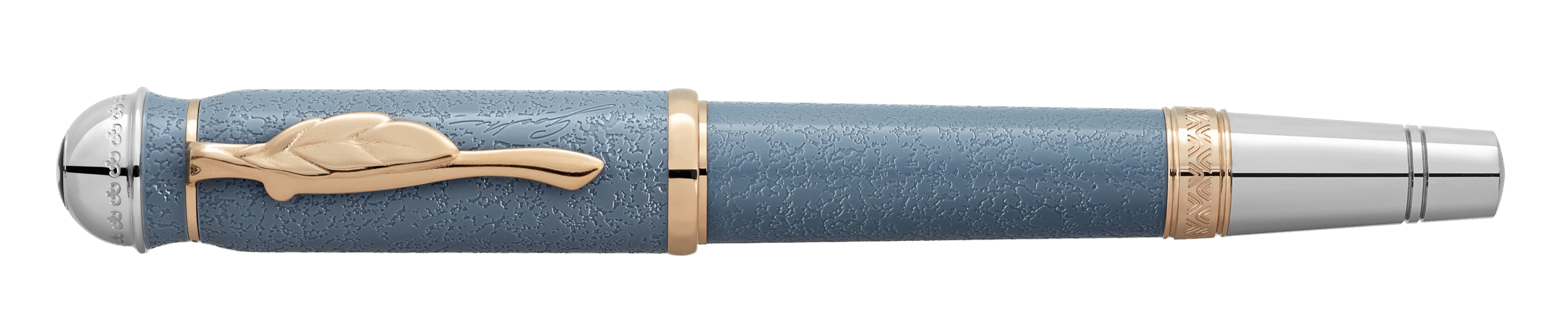 Un charmant motif ressemblant à un collier de feuilles de trèfle est gravé sur le dessus du capuchon. Ce détail provient d’une lettre écrite par Goethe à sa bien-aimée Charlotte Buff, qui a servi de modèle au personnage de Lotte dans Les Souffrances du jeune Werther. Œuvre remarquable du mouvement Sturm und Drang, le roman épistolaire du jeune Goethe a été salué comme un coup de génie et, surtout, comme un chef-d’œuvre de la littérature mondiale. Dans une lettre du 26 janvier 1827, Goethe a interprété le terme « littérature mondiale » d’une manière beaucoup plus littérale qu’aujourd’hui, signifiant un processus mondial de communication littéraire et de stimulation artistique mutuelle. De la même manière qu’il a incorporé des éléments de la poésie persane dans son cycle du Diwan occidental-oriental, cette littérature devrait aspirer à être l’expression de l’universalité, transcendant toutes les barrières linguistiques, ethniques et temporelles. Symbole de ce concept de dialogue littéraire global, incarné par le terme de « littérature mondiale » de Goethe, le capuchon prend la forme d’un globe, couronné par l’emblème de Montblanc.